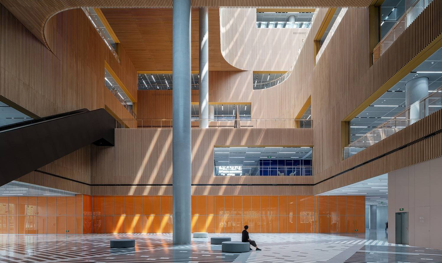 宏偉的中庭空間使用竹子、橡木和水磨石營造出開闊而溫暖的氛圍,熱情地歡迎到訪的讀者。不同樓層不同位置的中庭空間層疊交錯(cuò)、盤旋而上,七個(gè)樓層從視覺上被連接在了一起。