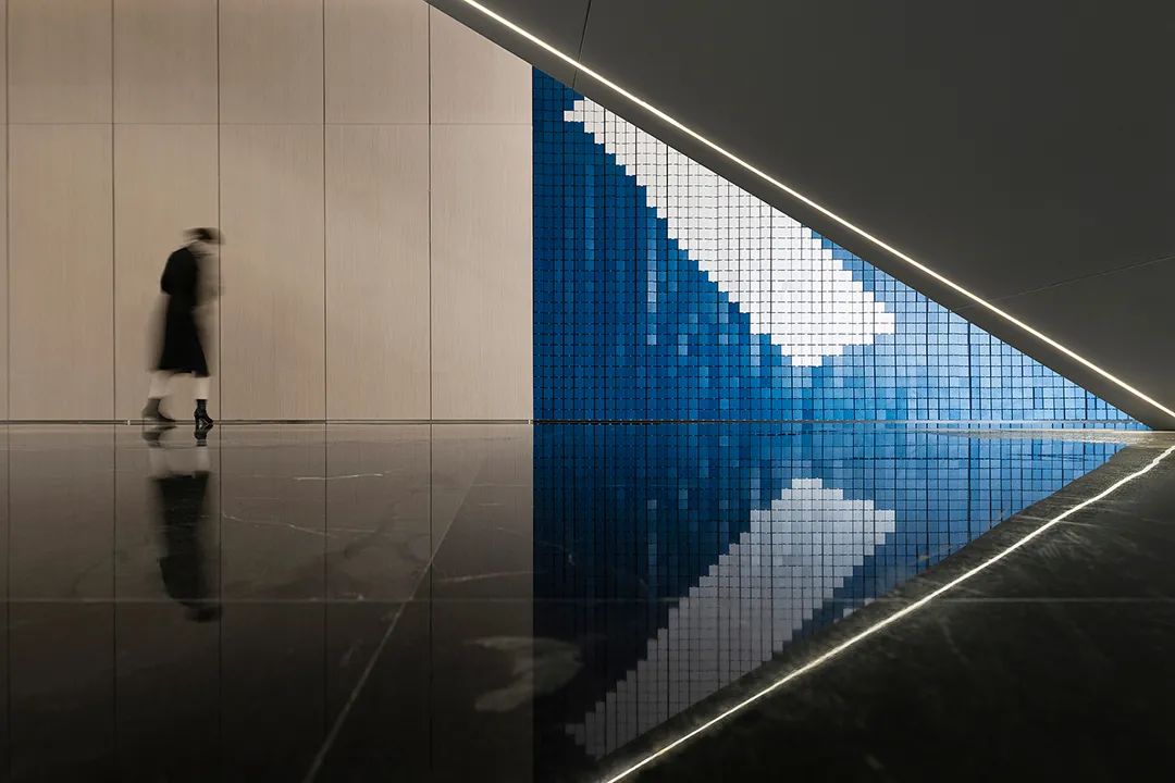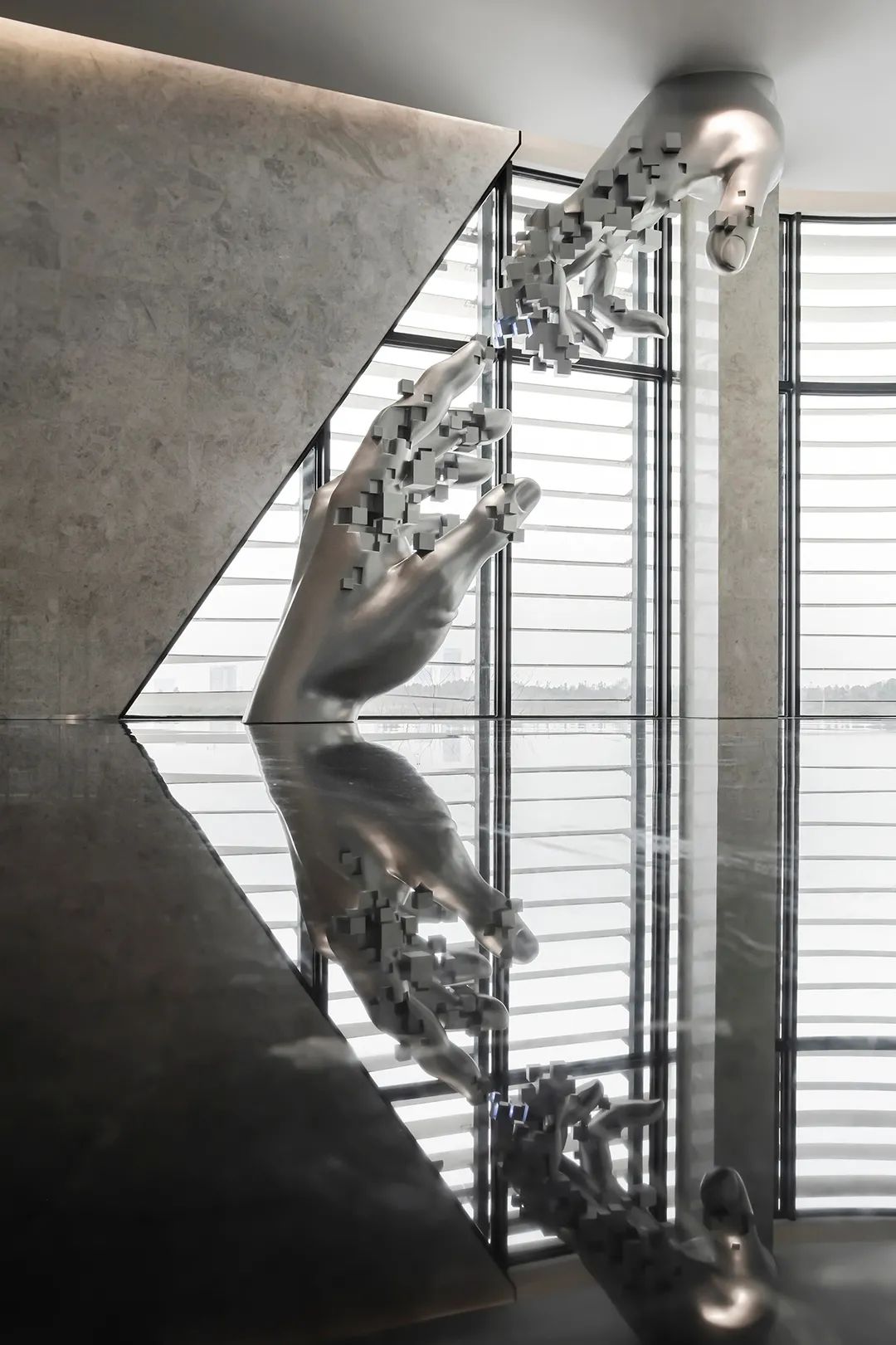 空間亮點在于,通過新媒體、交互藝術裝置、科技藝術裝置三大渠道,借由技術、工藝與美學的交織,讓人享受當下,感知未來,從而探索未來。在這一宏大的設計構想下,空間是對信息化時代的隱喻,“人們進入的銷售中心,我們將其擬作信息中心,設想來訪者是其中的信息源,以數字化狀態對信息中心進行探索,實現人與空間的新型交互。”