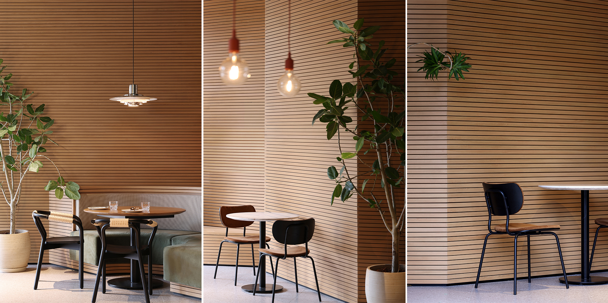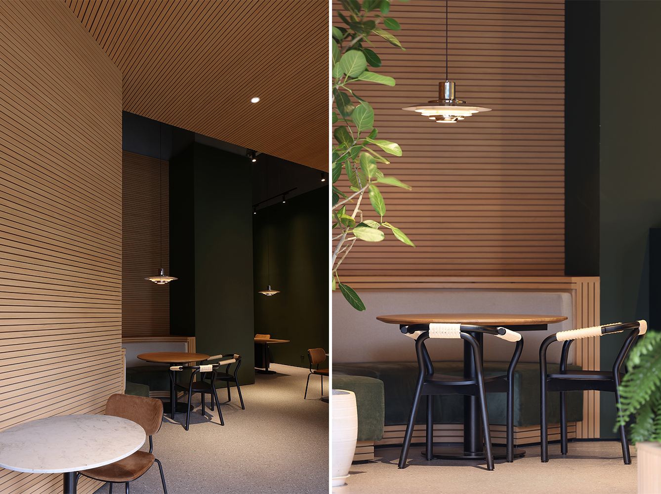 空間材質(zhì)以溫和的木質(zhì)搭配綠植為主,讓人與物的關(guān)系從城市的工業(yè)屬性轉(zhuǎn)化為自然屬性,為就餐空間創(chuàng)造一個(gè)具有場(chǎng)景性的綠洲環(huán)境。空間氣質(zhì)上盡可能避免給人一種“效率化”感受,顏色、材料選擇盡可能地體現(xiàn)“親生物性”,而空間中留有原建筑的跡象,讓二者之間并沒(méi)有形成強(qiáng)烈的分隔感,使其相互保持著一種對(duì)立與統(tǒng)一。