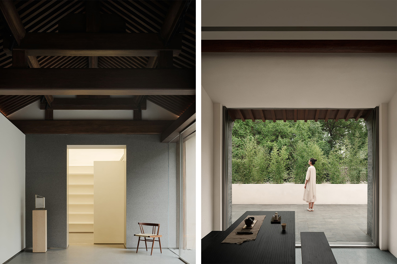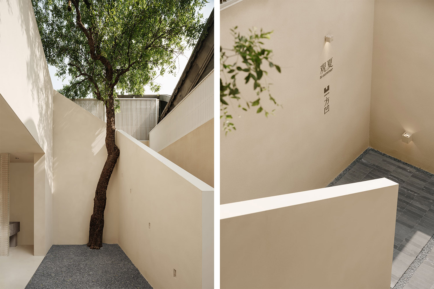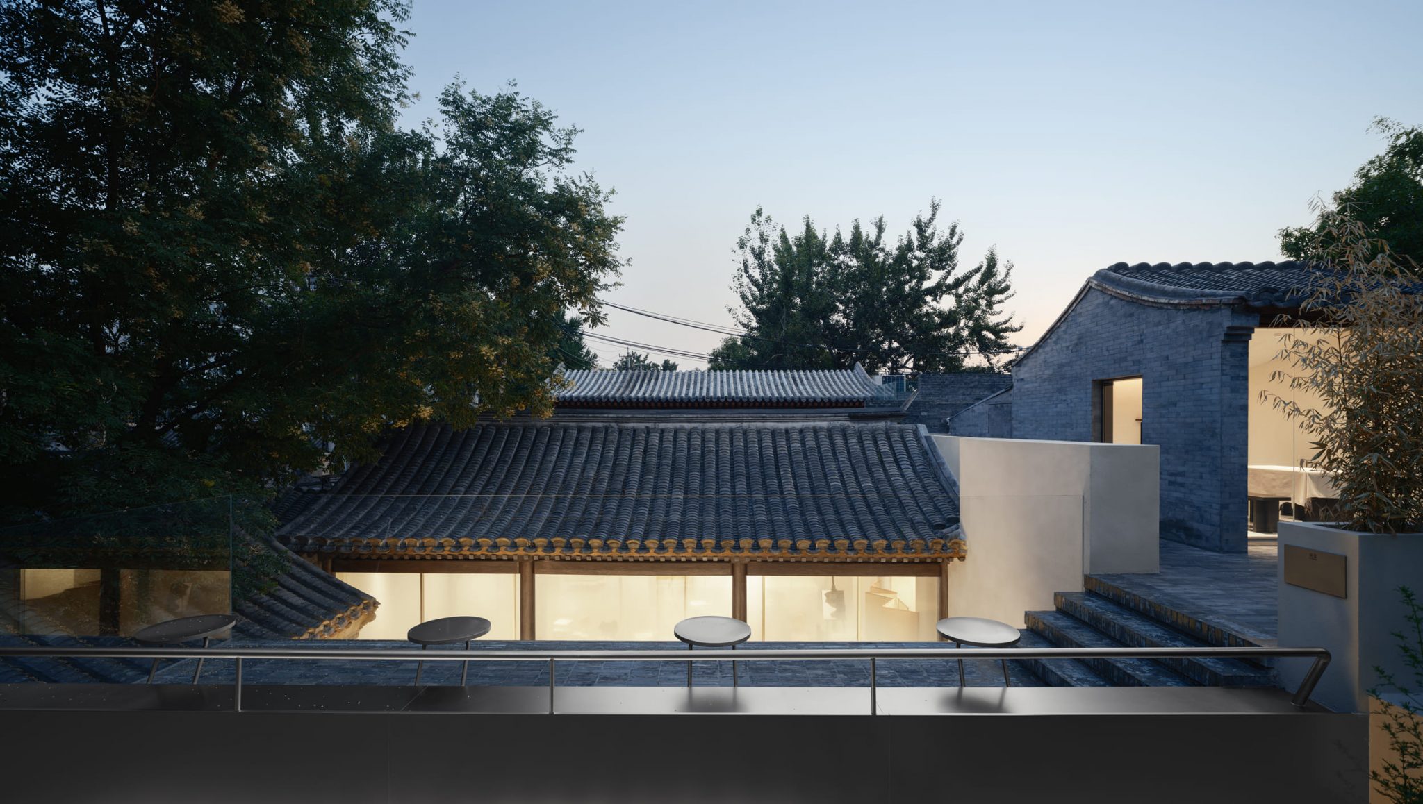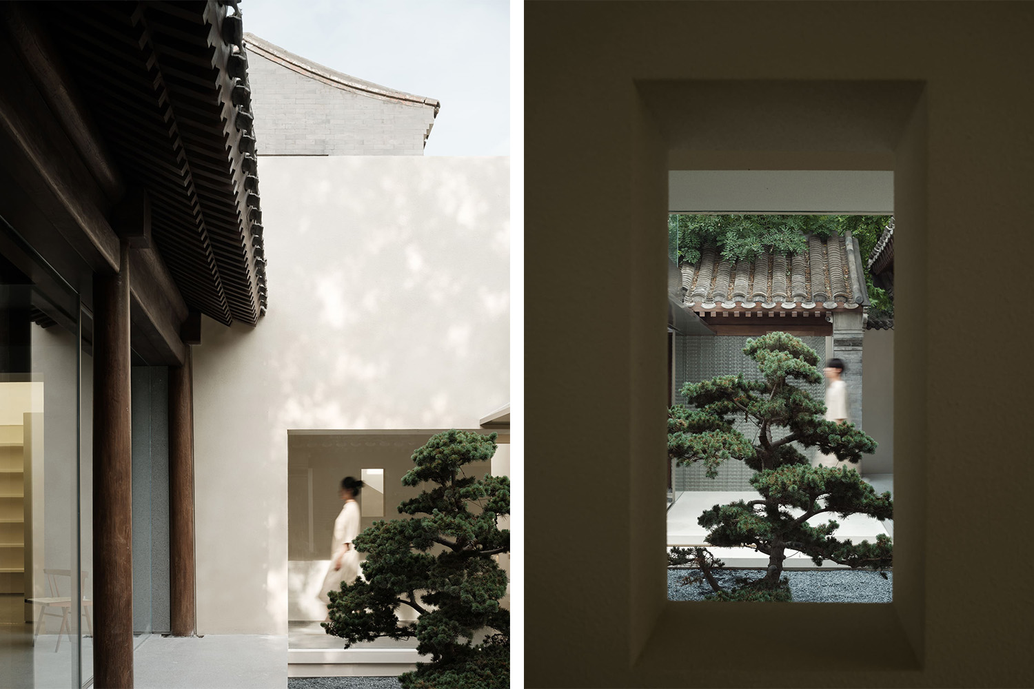 經過篩選的建筑構件和空間場景經過“二次曝光”呈現為一系列松散的平行結構。傳統四合院強調居住空間的私密性和院落之間的遞進關系,從門屋、廳堂到私室、閨房,布局方正,主次分明。而由民居到公共商業空間的改造勢必需要新的設計思維——用“反四合院”的方式,弱化了場地整體的封閉性以及院落之間的阻隔,圍合房屋的墻體多數被玻璃取代,充當物理阻隔的同時讓視線變得通透開敞,空間也擺脫了原本局促的尺度和動線。