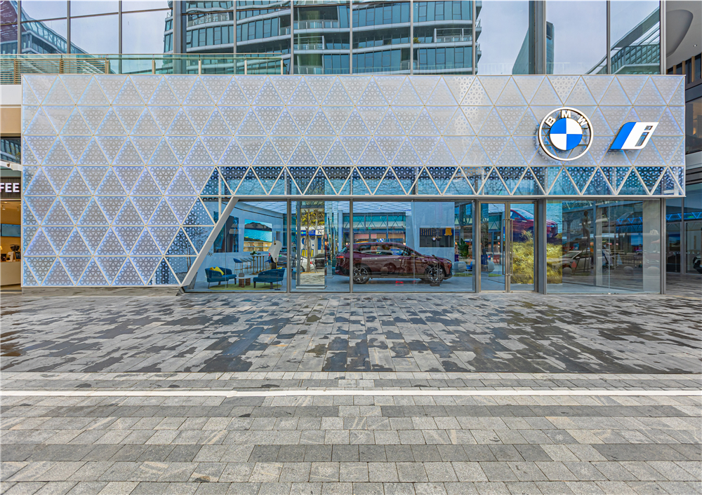 深圳歡樂港灣,是臨海的黃金商區(qū)。項目選址于此,希望其打造為一個有機(jī)的場所,賦能BMW i品牌,增益在地生活。因此,設(shè)計師要構(gòu)筑的不只是一個高品質(zhì)空間,更是以人為本的全方位優(yōu)質(zhì)交互體驗。進(jìn)店之前,數(shù)字化體驗旅程就已開始。迎賓立面覆蓋“BMW i車型前進(jìn)氣格柵的經(jīng)典菱型元素”為母題的半透明幕墻,以動態(tài)流轉(zhuǎn)的當(dāng)代光電藝術(shù),與城市產(chǎn)生對話。