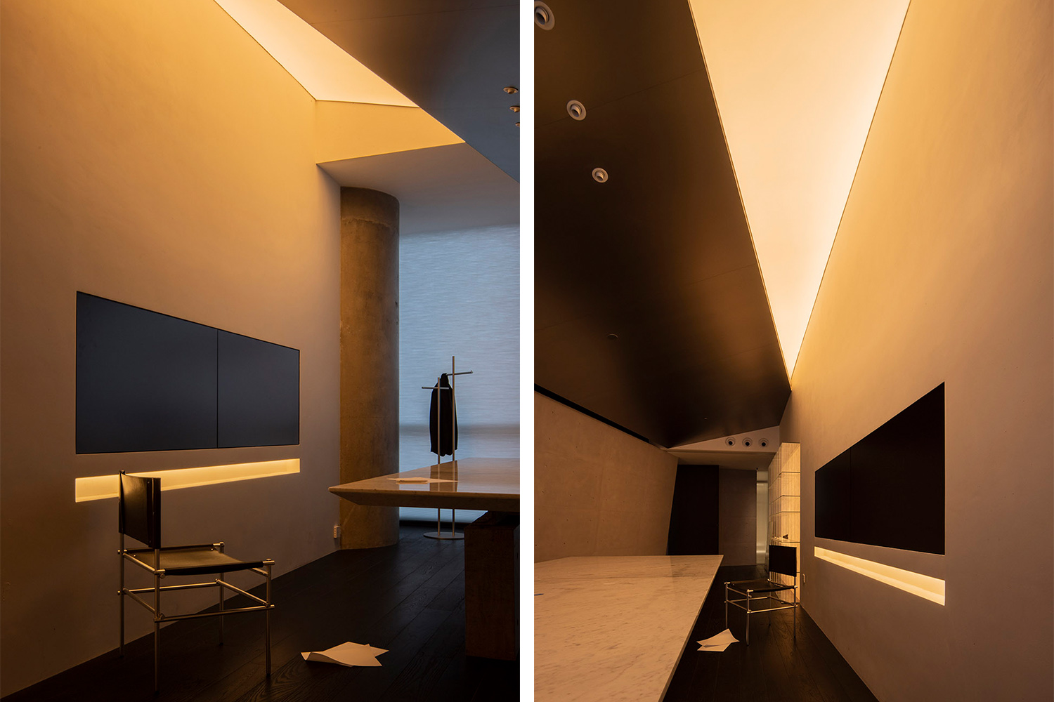 在空間構造上,通過在空間中構建三道清水混凝土墻體,在原建筑和墻體之間營造出新的場域。入口的斜墻是一種退讓的姿態(tài),也是功能的需求和視覺的引導;玄關的墻體起到對辦公區(qū)的遮擋作用,也承載了儲物的功能需求;中間最長的一道斜墻巧妙地構建出會客區(qū)和辦公區(qū)兩個主要的功能空間,墻體的斜切為空間帶來了強烈的視覺感官。