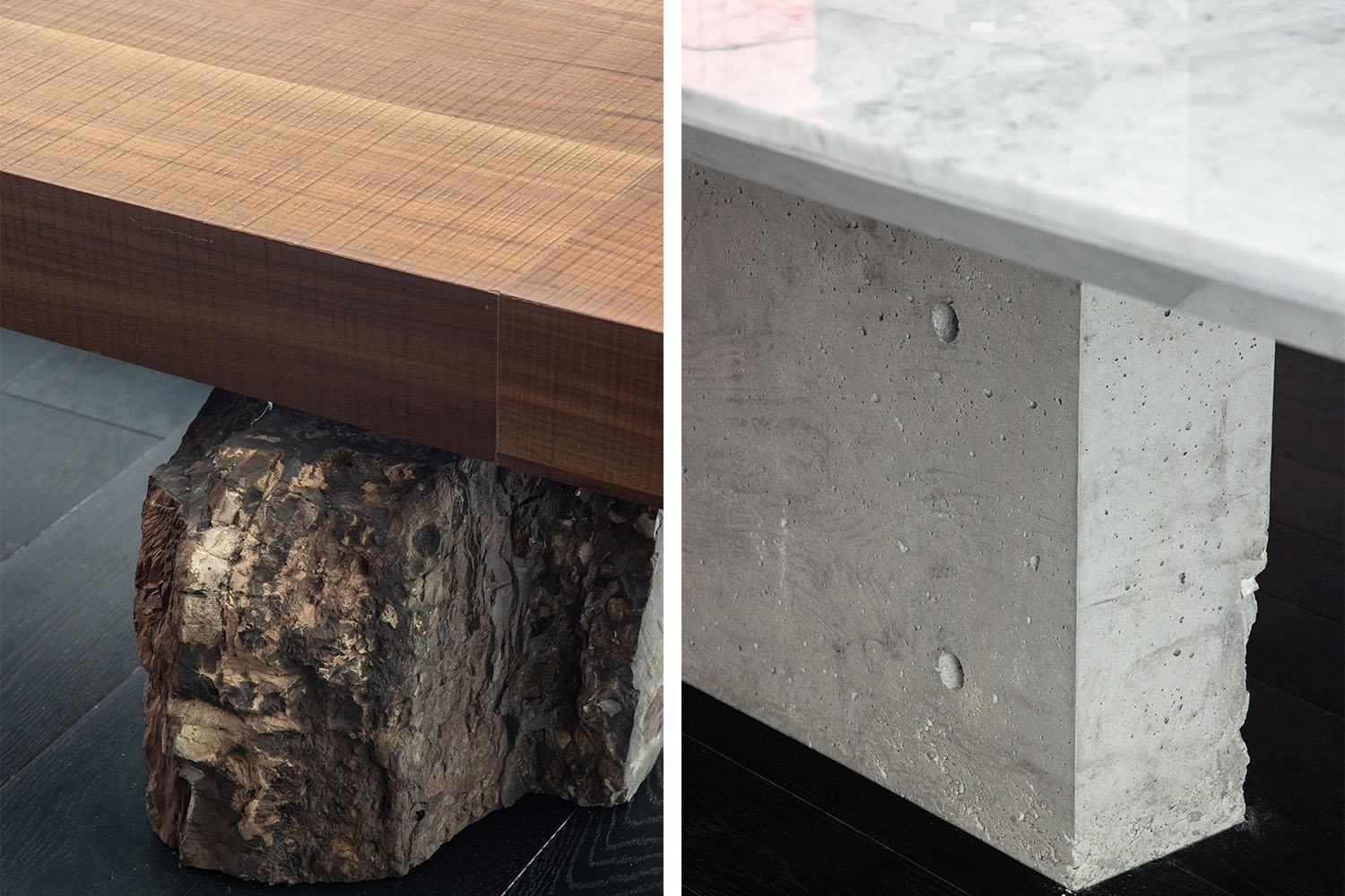 整個辦公空間的基調(diào)是理性顏色,帶著冷靜的思考,同時可以迸發(fā)思想性與活躍性,激發(fā)感性的領悟。墻面的清水混凝土、黑色的木地板、天花的金屬板作為空間的主基調(diào),石頭、木飾面、玻璃柜與辦公家具適配空間氛圍,營造理性與感性結合的辦公空間。各種材質(zhì)的互相碰撞,讓空間層次感更加分明。