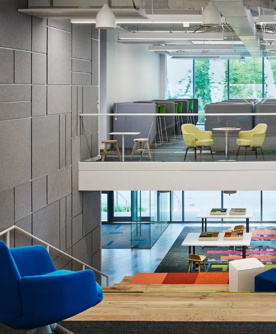 地毯品牌Interface在亞特蘭大的總部,Perkins+Will選擇了靜謐灰作為Logo墻主色調(diào),并選擇了Filzfelt的Akustika 10 Wall墻面吸聲系統(tǒng),降噪系數(shù)高達(dá)0.75.